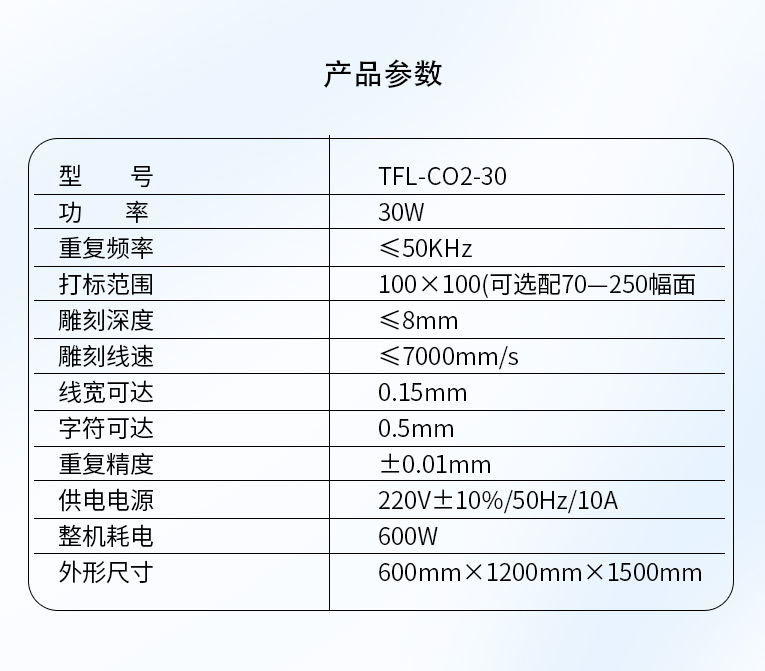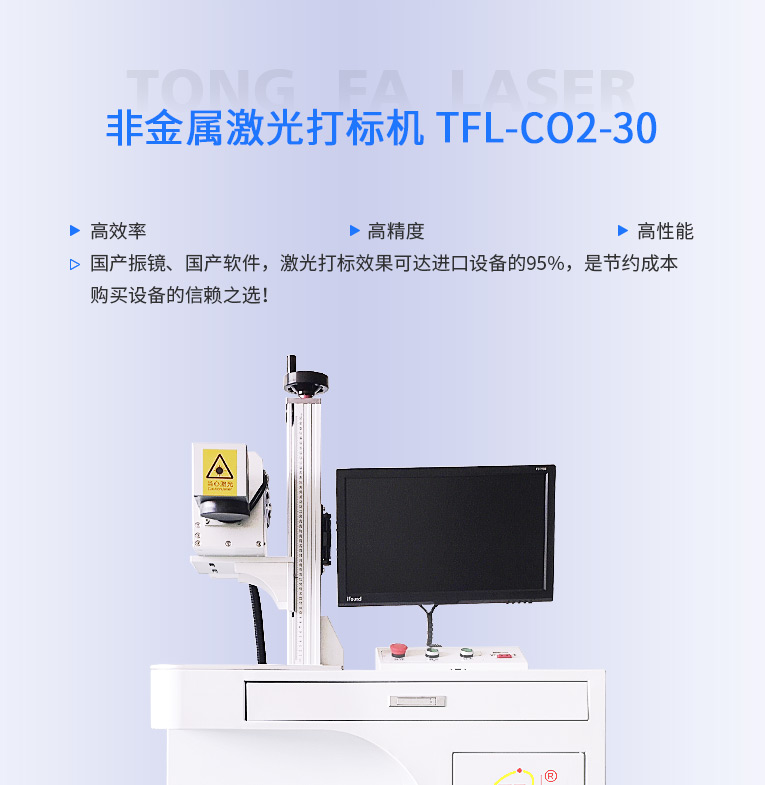 通發(fā)激光研發(fā)TFL-CO2-30非金屬激光打標(biāo)機(jī),是皮革激光打標(biāo)、木材激光打標(biāo)、石材激光雕刻、硅膠激光鐳雕等非金屬專用的二氧化碳激光鐳雕設(shè)備,本二氧化碳激光鐳雕機(jī)配置進(jìn)口射頻激光器等高端器件,性能穩(wěn)定!!!