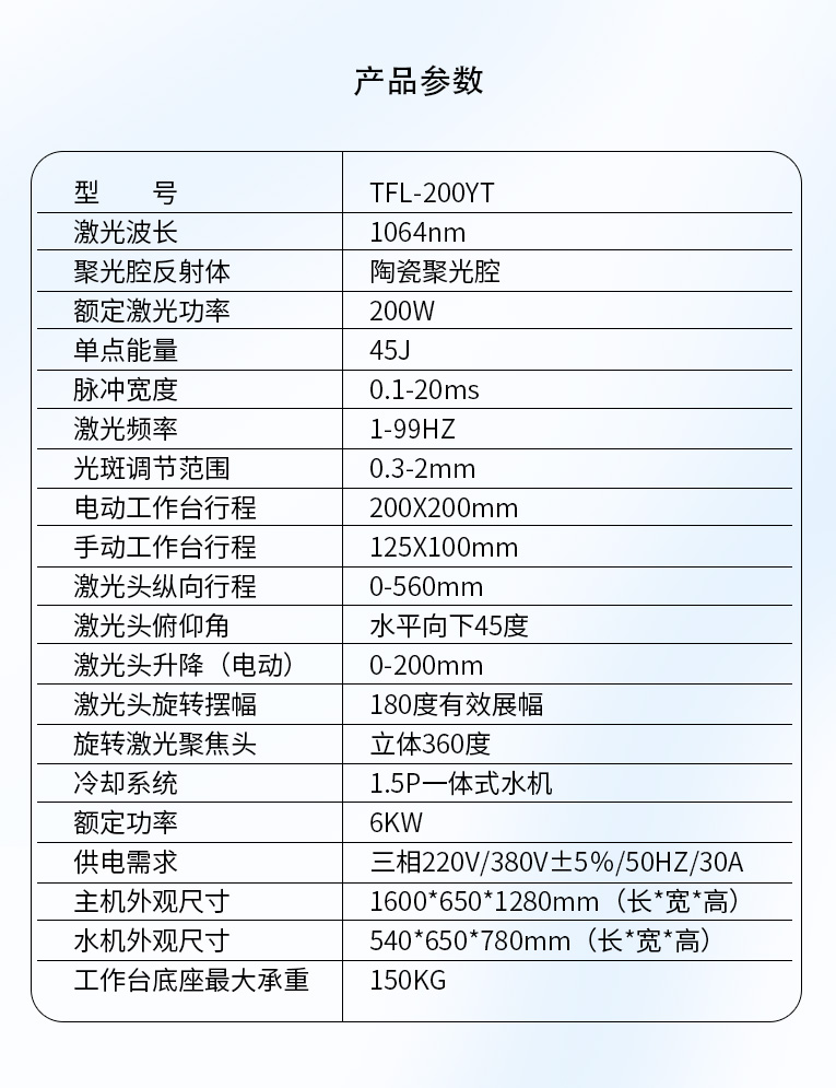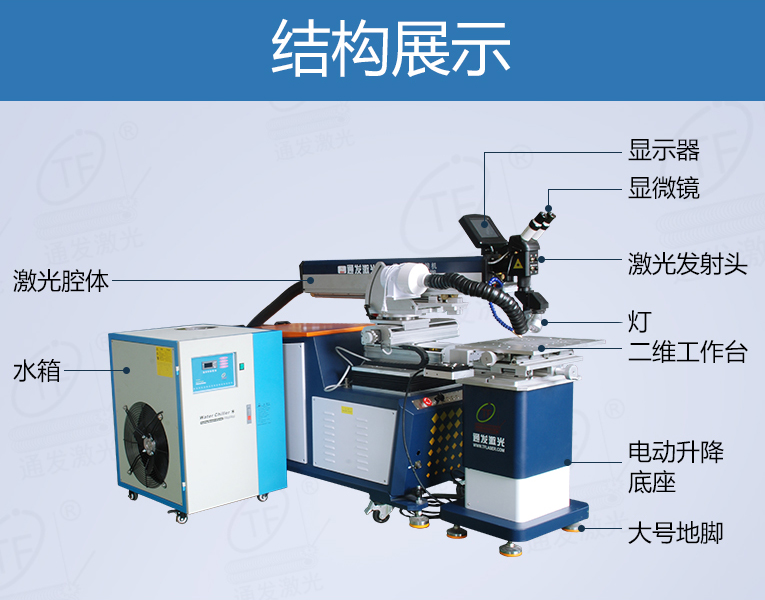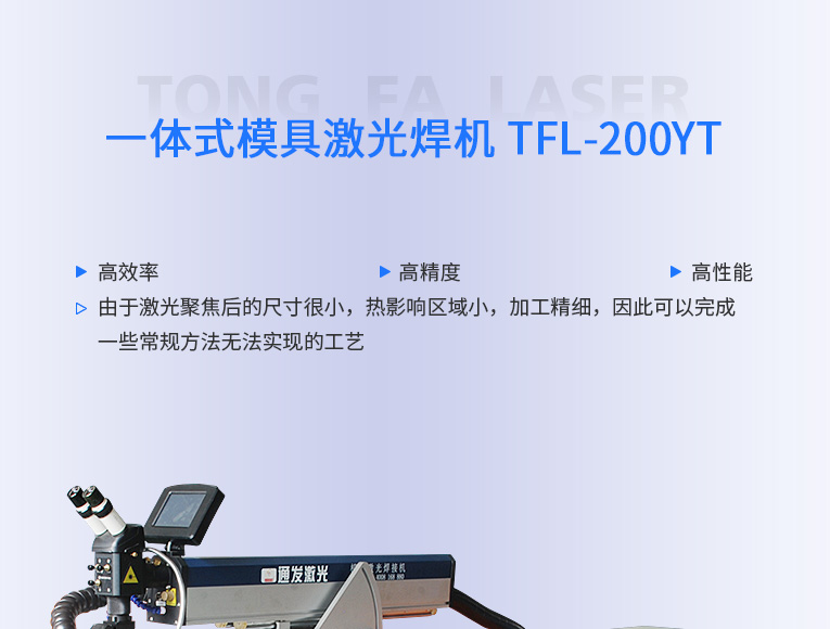 通發(fā)激光一體式模具激光焊機(jī)TFL-200YT/TFL-400YT是一款多種功能融合一體的新型模具激光焊接機(jī),針對(duì)特大型塑料模具激光焊、中型注塑模具激光燒焊、小型塑膠模具激光補(bǔ)焊、壓鑄模激光補(bǔ)焊具等各類(lèi)模具可實(shí)現(xiàn)超精密修復(fù),幫您解決大型汽車(chē)模具修復(fù)難題,不需要模具移動(dòng),電動(dòng)工作臺(tái)與立體旋轉(zhuǎn)激光頭完美結(jié)合,操作桿控制運(yùn)動(dòng)移動(dòng)實(shí)現(xiàn)輕松激光修復(fù)大型模具,同時(shí)也保留了傳統(tǒng)手動(dòng)工作臺(tái)超精密修復(fù)模具功能。