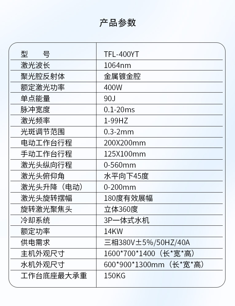 通發(fā)激光一體式模具激光焊機TFL-400YT是一款多種功能融合一體的新型模具激光焊接機,針對特大型塑料模具激光焊、中型注塑模具激光燒焊、小型塑膠模具激光補焊、壓鑄模激光補焊具等各類模具可實現(xiàn)超精密修復(fù),幫您解決大型汽車模具修復(fù)難題,不需要模具移動,電動工作臺與立體旋轉(zhuǎn)激光頭完美結(jié)合,操作桿控制運動移動實現(xiàn)輕松激光修復(fù)大型模具,同時也保留了傳統(tǒng)手動工作臺超精密修復(fù)模具功能。